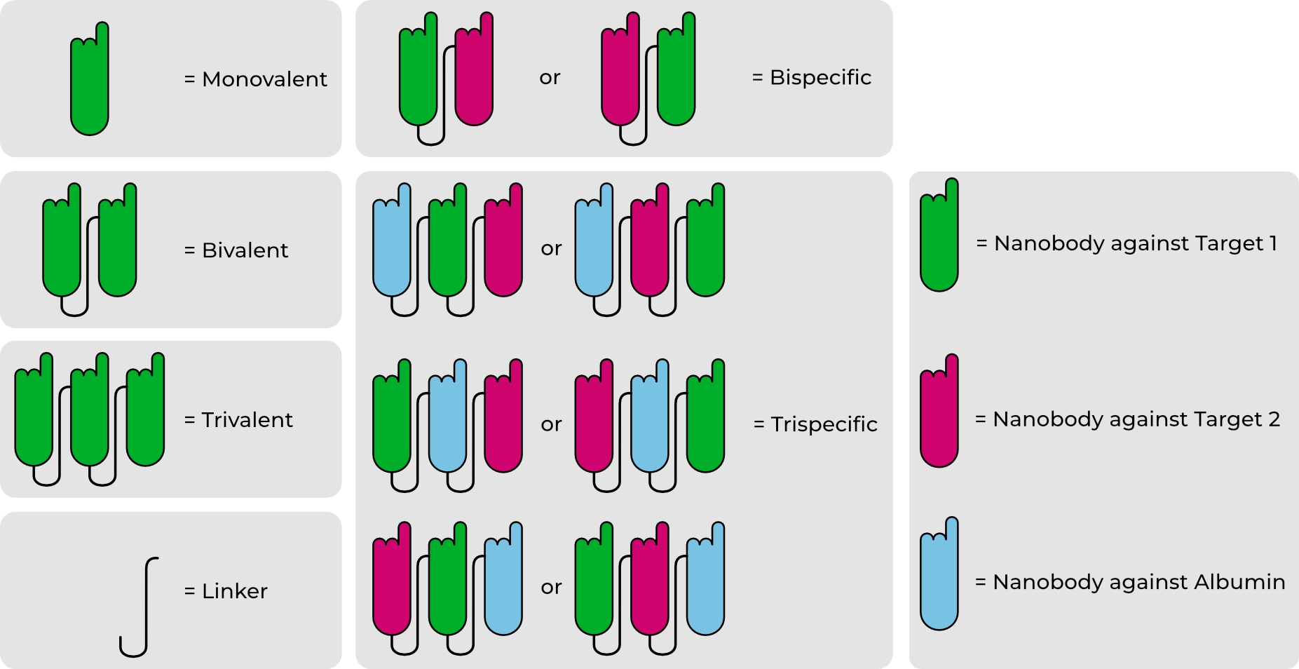 Figure: Examples of multivalent and multispecific VHH antibody constructs. Individual VHH domains can be linked flexibly or rigidly to form bi- or tri-valent molecules, or combined to generate bispecific and trispecific formats. Target-binding VHH antibodies (green, pink) can be combined with albumin-binding VHH antibodies (blue) to optimize pharmacokinetics while retaining the inherent stability and solubility of monovalent VHH antibodies.
